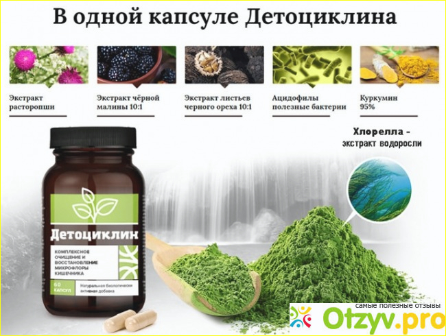 В состав детоциклина входят безопасные, растительные компоненты (расторопша, эфиры листьев грецкого ореха, ежевика). В день нужно принимать 2 капсулы дважды. Курс очищения длится месяц. 1 курс рассчитанный на 120 капсул обойдется при покупке через интернет в 1500 рублей. Цену трудно назвать выгодной и низкой. НО, достигнутый эффект будет того стоить.