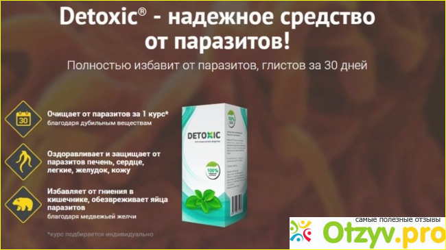 Это препарат, использующийся для избавления от паразитов в организме.. Производитель Detoxic заявляет, что он абсолютно безопасен, натурален и эффективен. Его основное действие направлено на борьбу с паразитами и на их яйца. Если зайти на detoxic форум, то читая отзывы можно понять, что переносится лечение легко и не вызывает побочных реакций. Действует на организм он мягко, и оказывает достаточно быстрый эффект, после накопления в себе активных компонентов.