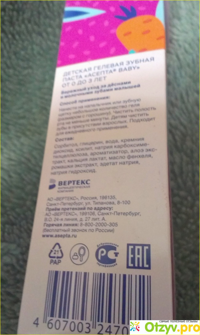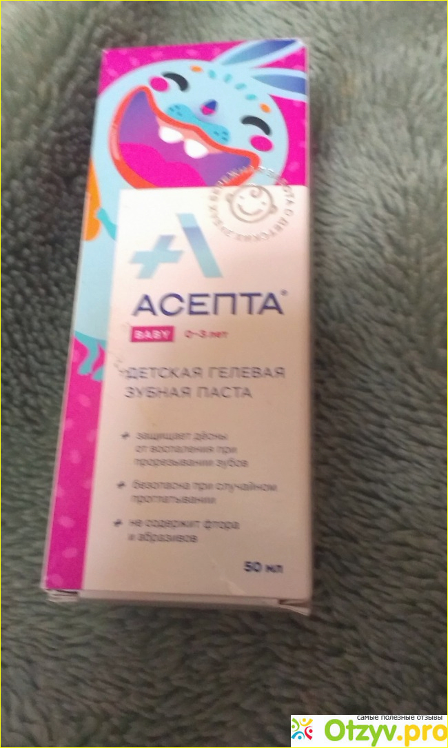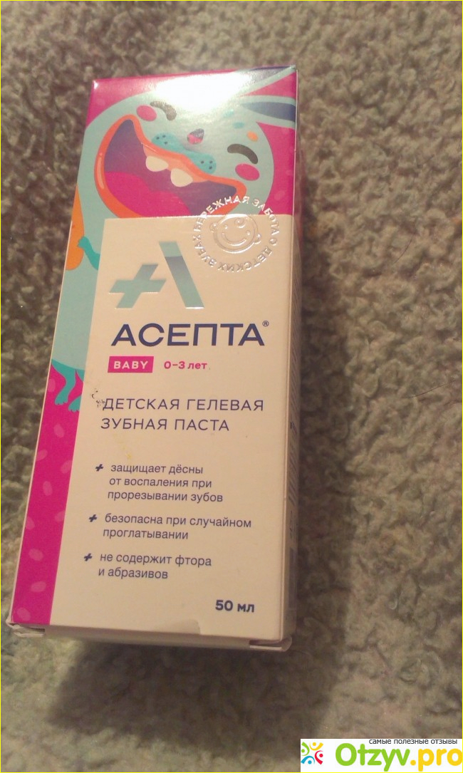 Если малышу нравится зубная паста, то процесс чистки зубиков будет проходить более успешно и радостно. Итак перейдём к более подробному рассмотрению пасты Асепта бэби. Продается тюбик с пастой в коробочке, на которой содержится вся необходимая для потребителя информация: состав, дата изготовления, срок годности, объём , способ применения и т. д