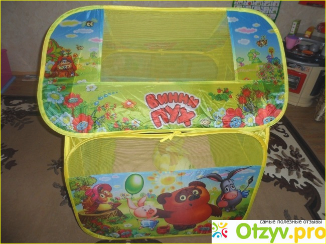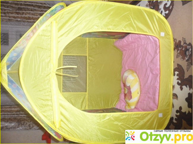 Палатка продается в сложенном виде в маленьком круглом чехольчике на молнии, веса практически не имеет, спокойно сможет нести и годовалый ребенок. На упаковке нарисовано, как раскладывать палатку, но когда вы её освободите от чехла, она раскроется сама, всё очень просто. Палатка приятного желтого цвета с рисунками любимых с детства героев мультфильма Винни-пух. Запаха не имеет.
