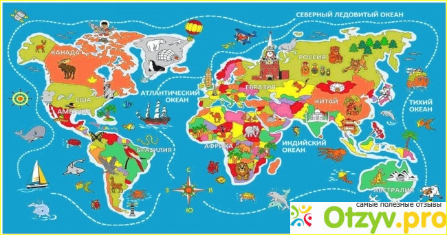 Ребенку очень интересно где находиться страна, в которой он проживает, кто ее соседи, какие страны занимают наибольшую территорию, где находиться море, куда мы собираемся ехать на отдых. На карте изображены рисунки, наиболее характеризующие конкретную страну, например: панда, сакура, матрешка, кенгуру, пирамиды и так далее; на месте где протекают моря и океаны - нарисованы рыбы, которые там обитают. Карта развивает память и со временем ребенок может запомнить название и расположение многих стран. Вы можете поиграть вместе игру, кто первый найдет где расположена конкретная страна и расскажет какие животные там обитают. Этот плакат развивает мировозрение, у ребенка возникает множество вопросов, ответив на которые он сформирует свое представление о мире. Думаю, что в близком будущем эти знания помогут ему в изучении географии, а вы вспомните школу и с легкостью, а главное интересно сможете ответить на все вопросы вашего чада.