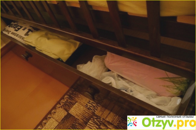 У кроватки внизу предусмотрен ящик. Ящик очень вместительный и высокий! У меня в нем хранится несколько комплектов постели, несколько комбинезонов, зимние, осенние, и еще куча всякой мелочи. Открывается ящик хорошо, с помощью двух ручек на фасаде. Очень продуманно – для родителей открыть легко, ребенку достаточно тяжело. Опять же, сравнивая с другой кроватью, ящик под которой ребенок открывает на раз. Правда, есть один момент – между ящиком и самой кроватью есть просвет. В верхнем положении ложа он достаточно большой и протирать пыль на ящике удобно, а вот в нижнем руку просунуть уже тяжеловато. Но, опять же, это если придираться. Можно и просунуть, и протереть)
