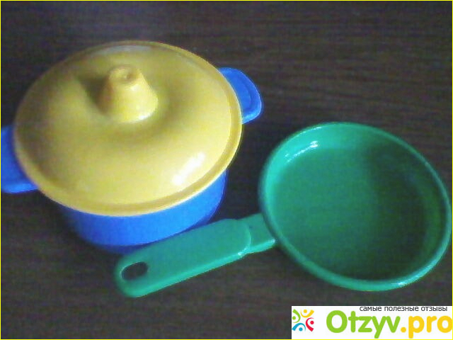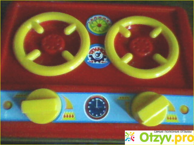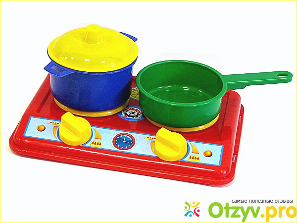 Моя пятилетняя племянница была очень рада подарку - сразу же все распечатала и принялась играть. Тут же и ее младший брат присоединился к игре. В данном комплекте нет ничего необычного, но все предметы легкие, яркие, компактные и прочные. Печка представляет собой пластмассовую панель красного цвета с двумя конфорками и двумя ручками для включения газа. Кстати, ручки крутятся. Конструкция довольно простая, но симпатичная. Для двух конфорок есть посуда - синяя кастрюля с желтой крышкой и зеленая сковорода без крышки.