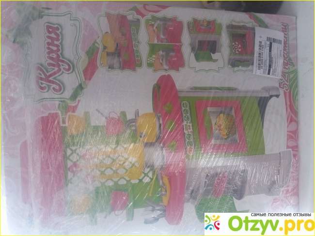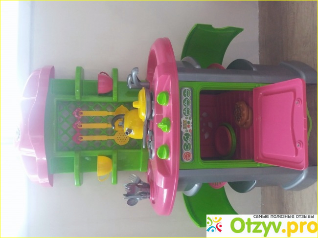 Кухня яркая высокая. сделана из толстого пластика. Состоит из стеночки с полками и основная часть -плита с духовкой и полочками. В комплект идут чашки, блюдца, тарелки, ножи, вилки, ложки, кастрюля с крышкой, сковорода, чайник и лопатка, поварешка, двухзубая вилка большая, и еще один предмет (забыла название). Духовка открывается, там есть дно, а не пустота. Можно крутить краник воды. Нет звуковых и музыкальных эффектов. При огромном желании эту вещь можно сломать. Плохо, что две части соединяются лишь двумя болтами. фирме стоило лучше продумать это место?так как можно верхушку разболтать и она потом держатся не будет.