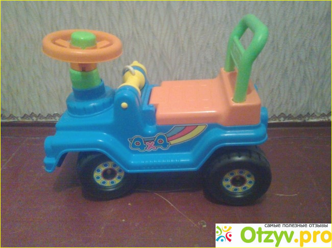 Бабушка с дедушкой подарили своему внуку, то есть нашему ребенку, машинку-каталку Джип 4*4 фирмы "Полесье". Ребенку очень понравился подарок бабушки с дедушкой. Мальчики же любят машинки. Сын катается на ней каждый день. Да и не только сын, но и я каталась на этой машинке. Так что каталка выдерживает вес до 40 кг точно (проверено на своем опыте). Удачно выбрали подарок - ребенок может играть с родителями, не только сам по себе на ней кататься.