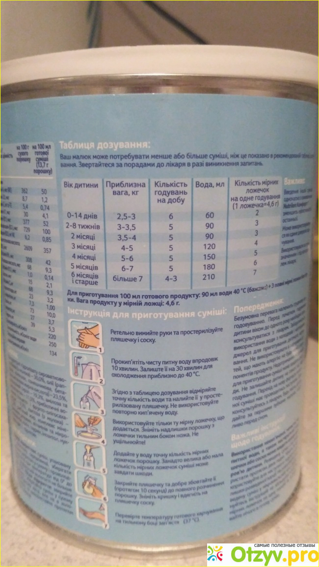 Упаковка красивая, в банке прилагается мерная ложечка желтого цвета. Ложечка удобна в использовании и позволяет легко, быстро и аккуратно насыпать детское питание в бутылочку. После того как мы отмерили нужное количество ложек в соответствии с возрастом ребенка (2 месяца), взболтали содержимое бутылки, детское питание легко растворилось, не оставив комочков и грудочек на стенках бутылки. В результате мы получили однородную молочную смесь, на вкус она приятная, сладковатая, напоминает грудное молоко.