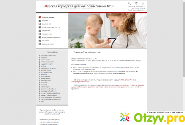 Здесь для вашего удобства возможна предварительная запись к необходимому специалисту, достаточно просто прозвонить в регистратуру и указать данные ребенка. Номер регистратуры написан на официальном сайте и время работы с перерывами также имеются.