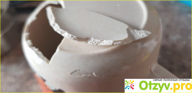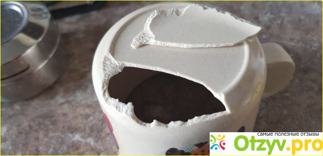 На вид как пластмасса. Когда по чашке стучишь ложкой, раздается характерный звонкий звук. На вкус как керамика.