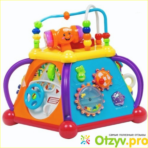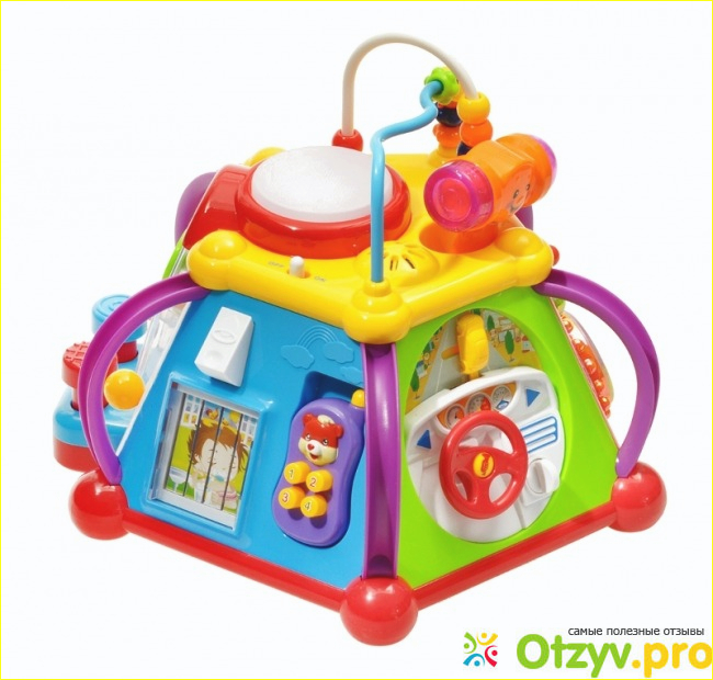 Верхняя панель-это кнопка, на которую ребенок нажимает и издается звук и загнорается кнопка белым светом. Звук типа Пеу. Так же сверху пальчиковый лабиринт. Нужно передвигать по пластиковым лабиринтикам разные по форме бусины. Моему мыну очень нравилось.