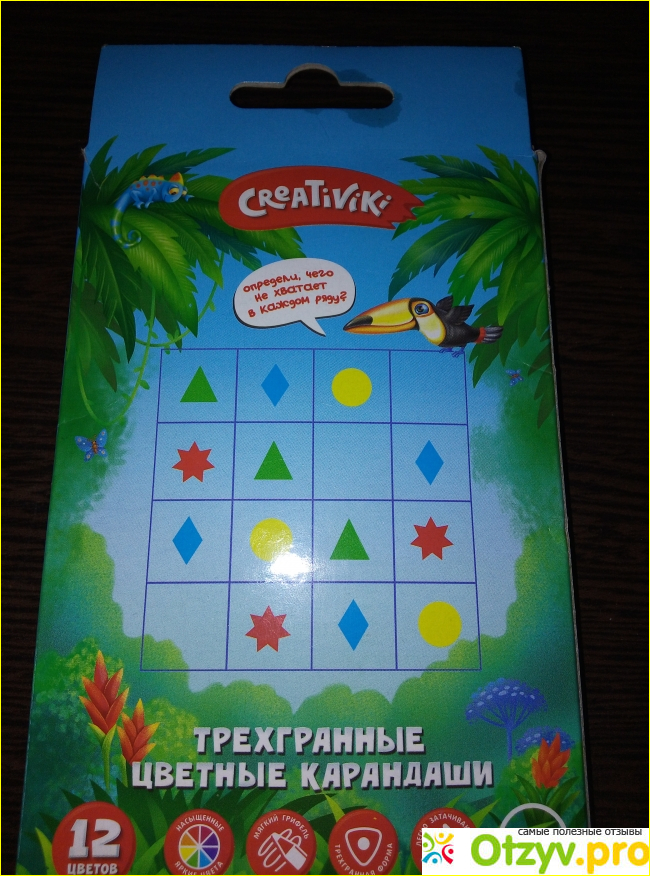 Марку карандашей, которую мы выбрали для сына стала creativiki. Так как сильно понравилась упаковка, количество карандашей, 12 цветов. Бонусам к карандашам стала игра для ребенка на обратной стороне. Где нужно угадать какой фигуры не хватает в ряду и клеточки.