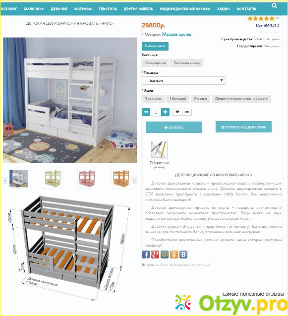 По уникальной фотографии можно уже утвердится в серьезности фирмы. Само качество фото разрешает рассмотреть все тонкости модели. Кроме описания предлагается выбрать цвет кровати, размеры и комплектацию (лестница и наличие ящиков). Это очень удобно, для заказа по индивидуальным требованиям.