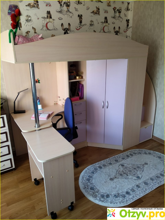 Занимает немного места в комнате 12 кв. м. Много места для хранения, 3 ящика в лестнице, угловой шкаф и пенал. Расцветка приятная: корпус - молочный дуб, фасад - ирис. Такая кровать существенно сэкономила место в комнате. Здесь в комплекте: рабочий стол, огромный шкаф, кровать, комод в лестнице. Бортики наверху высокие 40 см. Много разных полочек. Большое спальное место, места хватит и на взрослого человека.