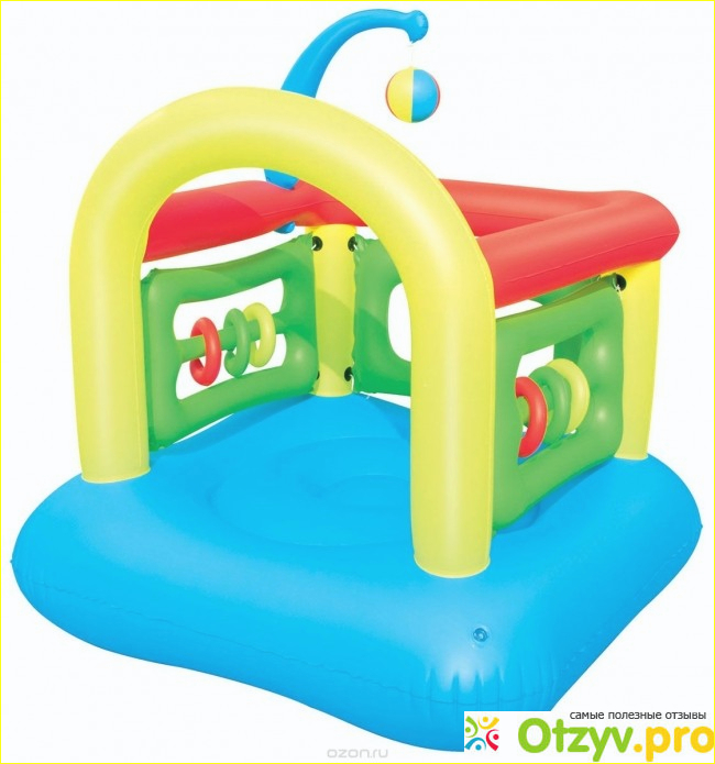 Данная модель детского батута сборная. У нее три бортика и арка. Бортики, да и все остальные детали, крепятся на завязках, что идут в комплекте. Это не очень удобно, потому что веревки периодически развязываются. На двух бортах по бокам висит по 3 колечка разного цвета с каждой стороны, всего их 6, мы их учимся считать. Сверху свисает надувная палка, к которой крепится мяч. Само крепление также на завязках. В 2 года ребенок уже спокойно достает до мяча, просто стоя. А вот в 1.5 года еще не дотягивался и было интересно. Максимальный вес, который выдерживает батут 65 кг. Размеры батута длина×ширина×высо а 142см х 142см х 165см соответственно. Насос в комплектацию не входит. Можно использовать обычный ручной, как для фитбола, можно машинный, специальный насос покупать не обязательно. Все детали надуваются отдельно. Прыгучесть у батута маленькая, так что он полностью безопасен для ребенка. Низ батута до пола также не проваливается. Все углы мягкие.