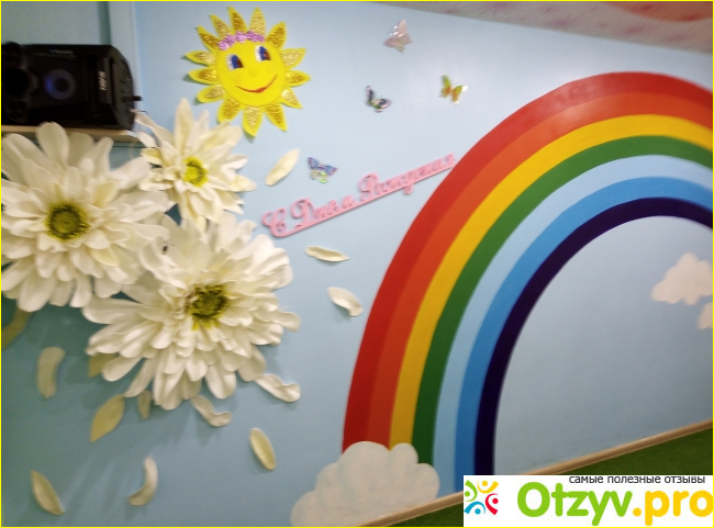 Огромный коридор, оформленный в стиле лета и сочных радужных красок с фото зоной.