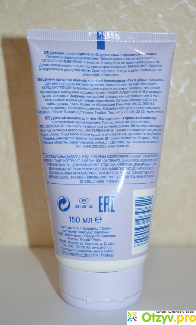 На тюбике есть общая информация о детском лосьоне, способ применения, состав, информация об изготовителе.