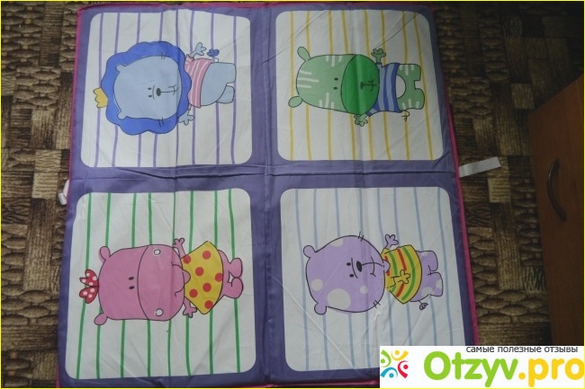 Очень меня привлек этот дизайн, повторюсь, не просто однотонная ткань, а веселые картинки, ребенок рассматривает, трогает. Сразу скажу, это днище, которое просто кладется на мягкое каркасное дно манежа, никуда не елозит, лежит плотно, и ребенок при переворачивании не сбивает его и не передвигает.