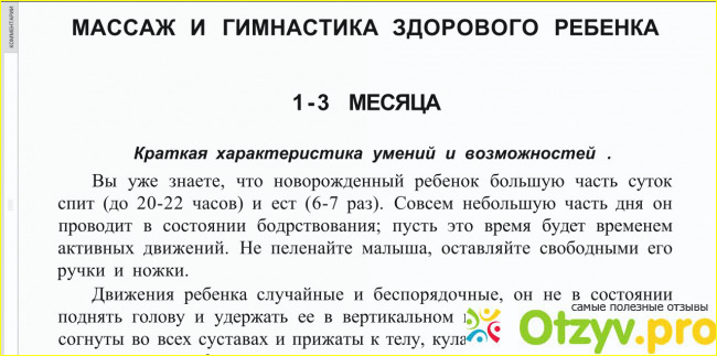 Каждый важный период разграничен. В книге Вы можете найти не только рекомендации по массажу, но и много информации развитию ребенка, так называемые "краткие характеристики умений и возможностей" для каждого возраста.