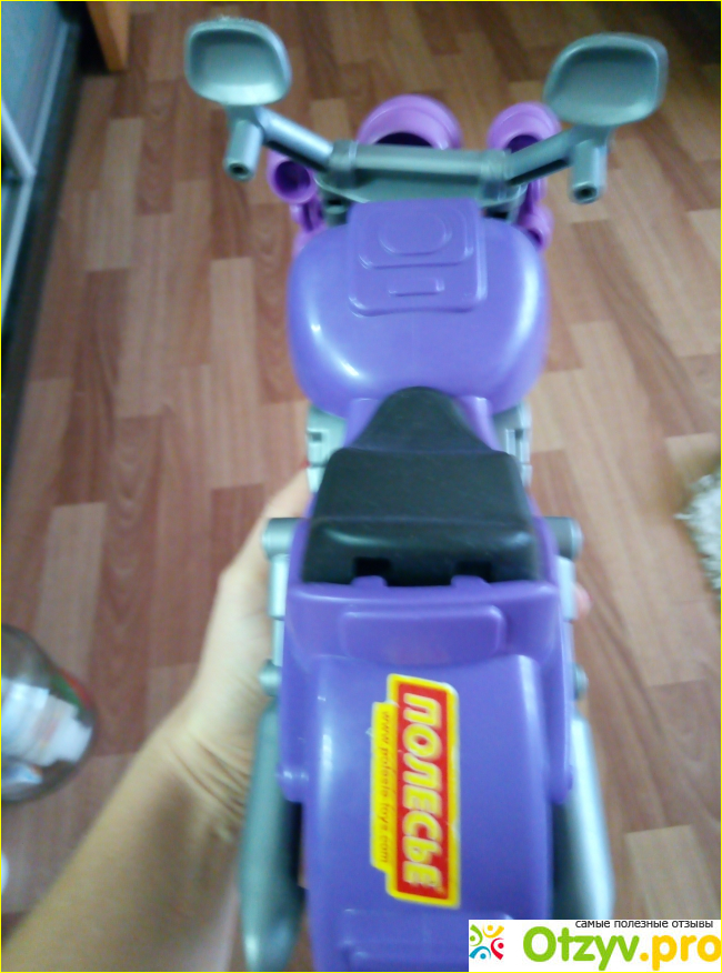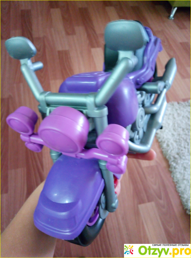 Отличное качество сборки, пластик не пахнет, его можно протирать от пыли. Цвет не меняется, точнее не выцветает. Пластик не царапается и не скрипит. Это Вам не китайская игрушка. А стоить такой мотоцикл примерно будет от 300-500 рублей. Все зависит от места, где Вы будете его покупать. Конечно в интернете они дешевле стоят. Довольна этой игрушкой и советую покупать именно белорусскую марку игрушек полесье.