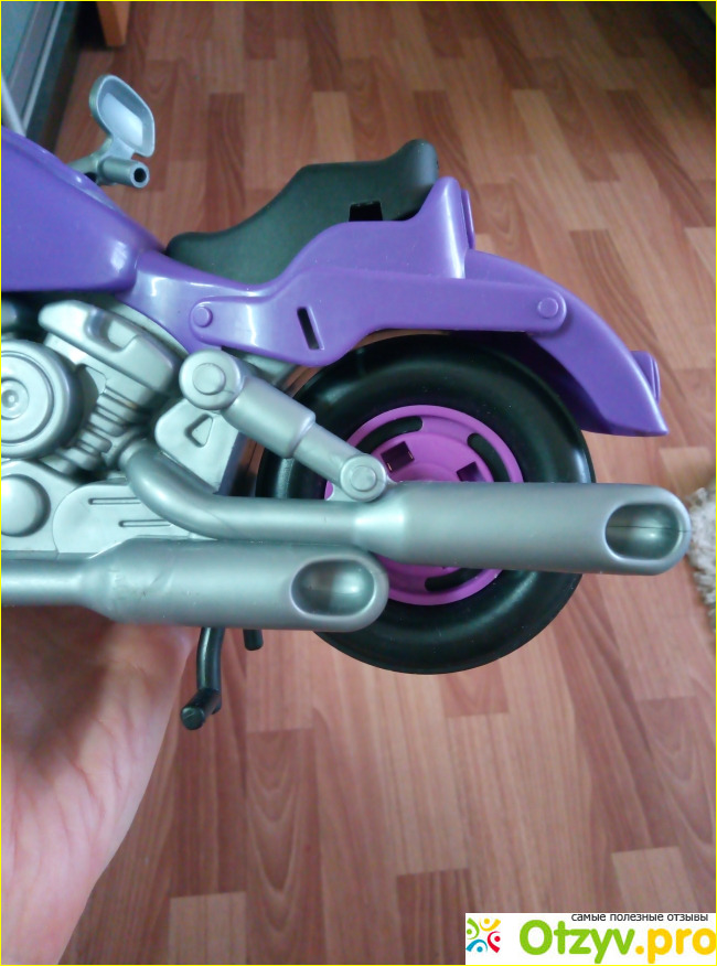 Мотоцикл имеет выдвижную подножку, на которую его можно поставить игрушку и она будет красиво припарковано стоять. Это удобно тем, что игрушка имеет устойчивость.
