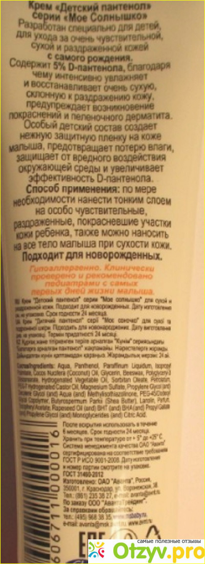 Благодаря приятном аромату, его с удовольствием наносишь на детскую кожу, и на свою тоже! Он моментально впитывается, эффективно работает. Участки кожи, которые требуют защиты и увлажнения, становятся смягченными, быстро проходит краснота, даже раздражение и любые ранки быстрее заживают. Можно использовать просто для рук, смазывать область промежности у дитя. Я использую его для себя после депиляции, в морозные и наоборот жаркие дни в области губ, а при кормлении смазывала им соски, так как были небольшие трещинки, пока у ребенка формировался правильный прикус. Даже наш папа его применял, когда у него было сильное раздражение от бритья. Он попробовал дешевое средство, получил раздражение от него, и единственное, что реально помогло – быстро и эффективно – это Крем пантенол Мое солнышко от Аванта.