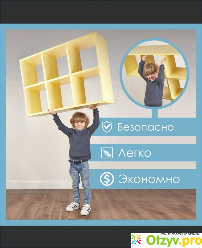 против остальных аналогов из ЛДСП, чья цена начиналась от 2 500р., отличная разница подумали. Не смутил цвет и то, что стеллаж по сути сделан из утеплителя, заказали на Озон, получили. По весу, наверно, 1кг не больше, никаких крепежей, собирается как конструктор Лего, даже страшно как-то. И что крепкий? Крепкий.... Реально. Загрузили по полной книжками ребенка и игрушками, стоит.
