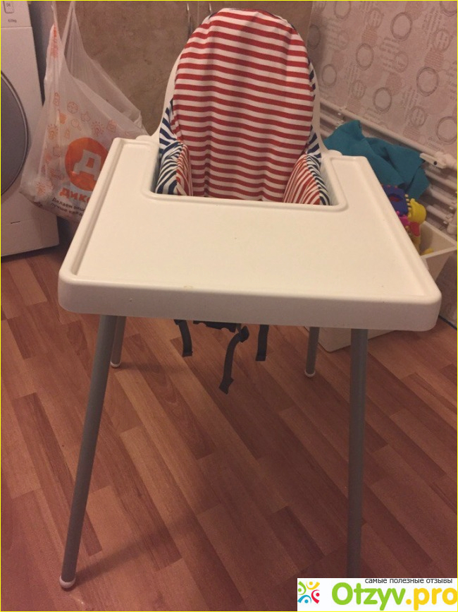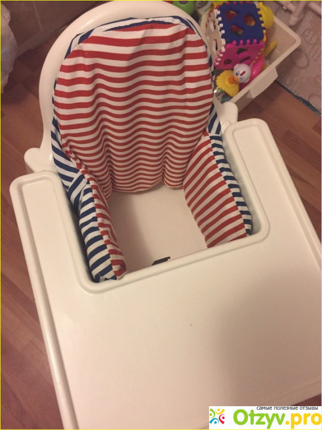 Минусы: у стула довольно-таки широко расставлены ножки, в отличие от других детских стульев, но, я думаю, это для того, чтобы ребёнок не смог его опрокинуть, так как он очень легкий. Отдельно к стулу продаётся надувная подушка и съемный чехол, который очень удобно стирать в машине. Подушка вставляется по краям (под попу не кладётся). Когда ребёнок подрастёт, ее можно вынуть и места становится гораздо больше, а можно и вовсе не покупать. Стоит она порядка 400 рублей вместе с чехлом. Нам ее новую подарили, поэтому точно цену не назову.