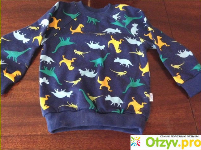 Пару раз одевали, но слышать как малыш плачет при одевании, а потом во время снятия свитера, я не могу. Нет уж, увольте. Для более старших деток вариант, скорей всего, хорош. Резинки на горловине, рукавах и по низу свитера плотные, ветер не задувает. Цвет не изменился. Рисунок как был ярким, таким и остался. Рисунок, к стати, и на спинке таков же, как и впереди. Свитер на фото кажется большим, но на годовалого малыша он был лишь немного длиноват и чуть-чуть свободен (размер 80-48). Свитерок совершенно обычный, но с синего цвета штанами смотрится хорошо. В шве на лицевой стороне пришита бирочка с указанием торговой марки.