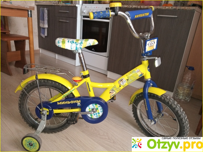 Доброго времени суток, уважаемые читатели. Хочу рассказать про детский, двухколесный велосипед торгового бренда Navigator (производство Китай) с тематикой "Миньоны" имеющий диаметр колес 14 дюймов. Данная модель велосипеда имеет дополнительные два колесика, которые крепятся по бокам заднего колеса, на велосипеде с данным диаметром колес будет удобно кататься детям от 3 до 6 лет.