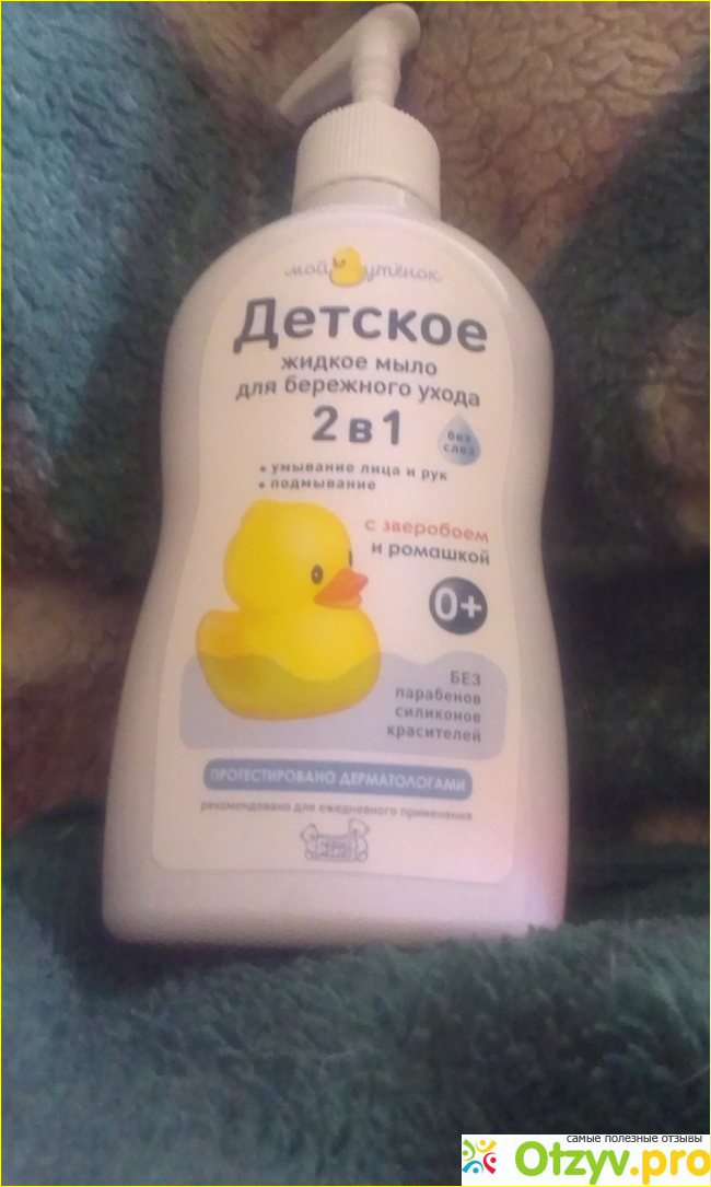 Белая бутылочка с дозатором, с изображением жёлтого утёнка. Дозатор выдает небольшие порции мыла. Мыло прекрасно пенится., легко смывается, не оставляет на коже плёнки. Объём-250 мл. Изготовлено по Гост. Мыло подходит для мытья рук и лица, а так же для подмывания.