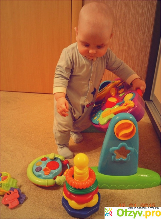 Нашему малышу не сразу стало понятно что для чего в этом руле. Сейчас ему уже 1год и он с интересом играется им. Батарейки еще не меняли, и не нужно. Звук по прежнему громкий и не севший.