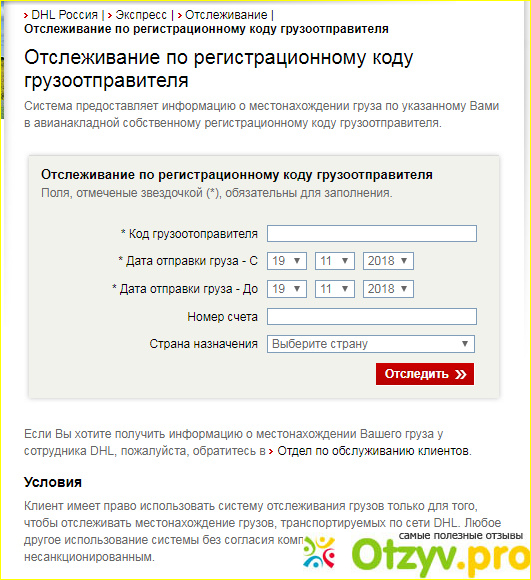 В свою очередь, посредник, который оказывает вам услуги по пересылке или транспортировке, выдает вам же некие гарантии. Один из самых современных сервисов гарантированного перемещения отправлений, является служба отслеживания. Компания предоставляет такую возможность для своих клиентов непосредственно на сайте в разделе "Отслеживание грузов DHL Express".
