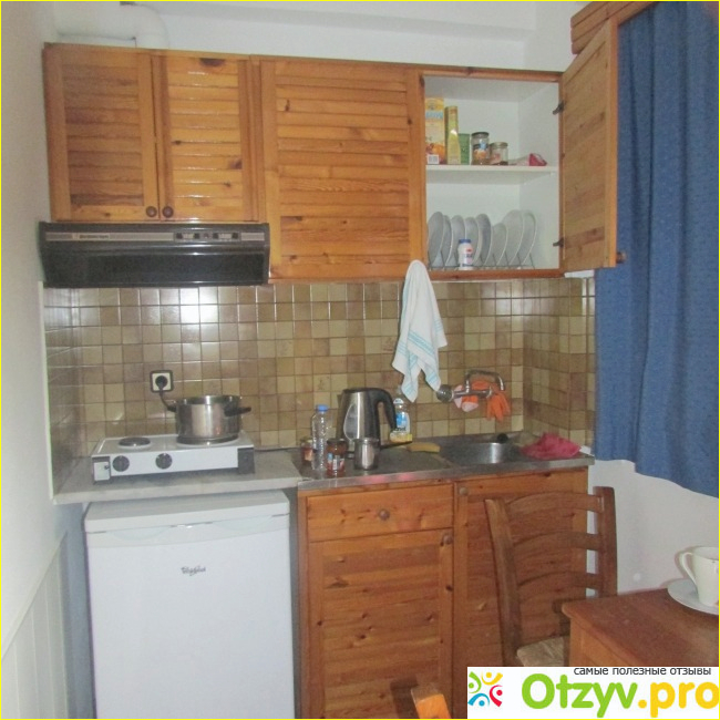 Апартаменты новые, оформлены в традиционном греческом стиле, очень удачной планировки. Помимо двух кроватей, которые вместе с туалетным столиком составляют спальню, есть еще небольшой угловой диван и столик – гостиная зона, и рядом с ней кухня с электроплиткой, вытяжкой, холодильником, электрическим чайником, шкафами с различной посудой, небольшим обеденным столом.