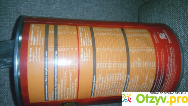 Информация на банке на 3-х языках, русский язык, английский язык, французский язык. Состав, способ приготовления, информация о производителе.