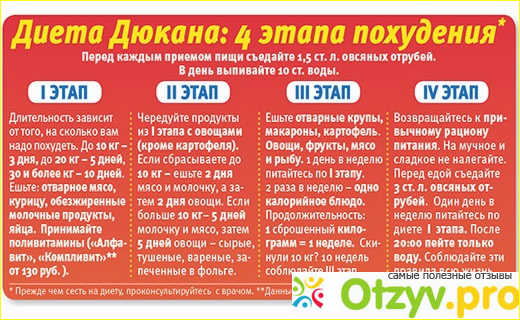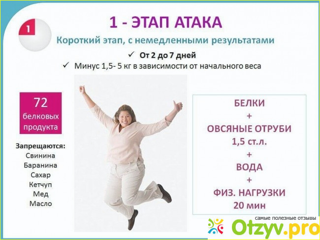 Начну сразу с фаз. Первая называется "Атака" и длится она примерно пять дней, за этот срок вы максимум можете сбросить свой вес, она довольно тяжелая, но переносимая. По окончанию атаки нужно переходить к следующему этапу - "Чередование", длится она может несколько месяцев, как только почувствовали улучшение результата переходим к "Закреплению", здесь необходимо тщательно отслеживать свой вес: как только будет выполнено условие: похудение на один килограмм за один день, можно переходить к завершающей стадии - Стабилизация. Тут мы просто балансируем свое питание, при этом также нужно будет воздерживаться от жирной и вредной пищи.