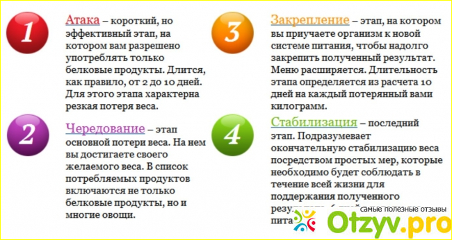 Фаза консолидации является третьей фазой диеты. Это время, когда эта строгая диета должна была окупиться. Вы достигли своего целевого веса, но рискуете воспользоваться хорошо известным «эффектом йо-йо», если не обращаете внимания на то, что вы едите. Поэтому эта фаза предназначена для того, чтобы держать ваш здоровый вес под контролем и предотвратить увеличение веса. Это переходный период между строгими диетами и возвращением к нормальной пище. Преимущество в том, что теперь вы можете добавлять в свой рацион более вкусные продукты, которые были запрещены на предыдущих этапах. Это рискованный период для восстановления веса после диеты около десяти дней на каждый потерянный килограмм. Это также время, когда вы должны оставаться на этапе консолидации. Поэтому, если вы потеряли 5 кг, вы должны оставаться в фазе 3 в течение 50 дней. На этой стадии вы можете съесть небольшое количество углеводов, но они никогда не должны составлять основу вашего рациона. На этапе консолидации можно объединить все продукты, начиная с фазы атаки и фазы круиза.
