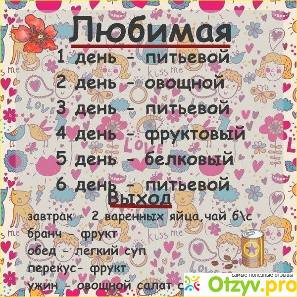 Любимая диета предназначается для тех людей, которые желают очень быстро и навсегда избавиться от лишнего веса. Меню в данной диете раcчитано на 7 дней, Однако если человек страдает ожирением, а то возможно продление этой диеты ещё на одну неделю. Чтобы усилить ее эффективность врачи рекомендуют заниматься во время ее прохождения легкими физическими упражнениями.