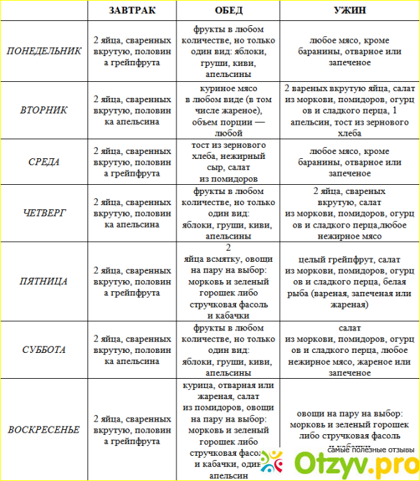 На самом деле, это одна из тех немногих диет, которые предлагают человеку достаточно скудное и очень однообразное меню. Однако, зачастую именно диеты с подобным меню и приносят результаты в сбросе лишних килограммов. Что касается данного режима, то та пища, которая не обозначена в меню весовой характеристикой, может потребляться без каких-либо ограничений. Также, в обязательном порядке необходимо пить не менее двух литров воды в день, можно также баловать себя чаем, как черным так и зеленым, и даже кофе. Но и тут существуют ограничения, нельзя добавлять в данные напитки сахар и например молоко, что касается кофе. Далее, вы можете ознакомится с рационом питания, который присущ данной диете.