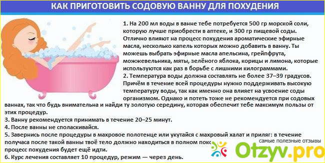Второй способ содовой диеты - это содовые ванны. Принцип действия очень прост, вам нужно взять 300 грамм соды и развести их в 200 литрах горячей воды. Данный способ способствует ускорению процессов в лимфатической системе, что в свою очередь способствует к ускорению расщепления жиров и вывод подкожных жиров. Замечалось, что если в течении 25 минут принимать ванну на соде, то можно избавиться от 1,5 килограмма лишнего веса, что согласитесь довольно неплохой результат.