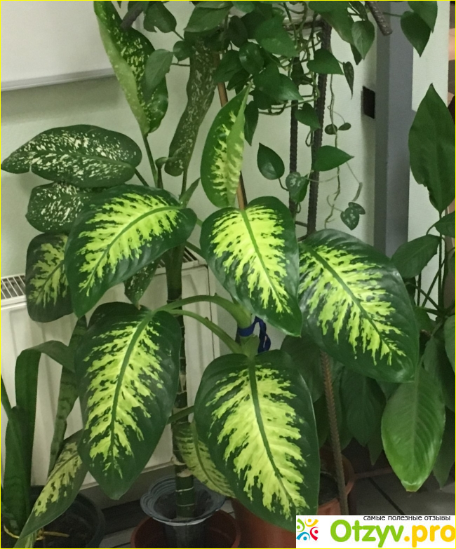 На самом деле я не особый фанат растений вы том числе и комнатных, но у меня муж просто сходит с ума по всему вечно зеленому и растущему. Приехало данное растение к нам из Южной и Северной Америки. В уходе очень не прихотливое растение, но все равно надо придерживаться определенного ухода за ним. В данное время насчитываеться 52 вида растения, но далеко не все можно держать дома. Из самых распостраненных для дома являються такие виды:Диффенбахия пятнистая, Леопольда, приятная, Эрстеда. Растение любит свет, но умеренный, рассеяный как говорят. На прямых солнечных лучах расстение может обжечь свои листики. Так как родиной его являеться Южная и Северная Америка, а климат как известно там тропический, то поливать его нада каждые 2,3 дня. Как только подсыхает верхний слой. А протирать листики и сбрызгивать водичкой нужно каждый день. Так как я уже писала что цветок любит солнце, ему категорически противопоказаны сквозняки, смена температуры, холодный воздух. Со временем растение теряет свои листики и становится не очень так на вид, для этого надо обрезать верх и оставить 10 см. это даже и к лучшему, ведь верхушку можно укоренить и вырастить новое растение. Наверное будет смешно когда я сравню растение с медведем, но ему в период осень-зима надо отдых, меньше поливать. Как будто впадает в спячку. В настоящее время существует огромное количество гибридов. Очень хорошо подходит для светлых комнат, оранжерей, зимних садов. скажу то что наверное самое главное, мы выращиваем дома комнатные растения для того что бы было красиво, нам нравиться ухаживать за ними, они полезны. исключая один минус про ядовитость, есть и положительные моменты что растение являеться очистителем воздуха, оно очищает воздух от вредных токсинов. А это я Вам скажу не мало важно. И кстати не смотря на свою ядовитость стебля, листики очень любят коты, это проверено на собственном опыте, у нас дома живет кошка и чем то я даже незнаю чем листья есть она любит. И наличие в доме ребенка заставило мужа убрать повыше растение, что бы не отравился ребенок и что бы его не сьела кошка.