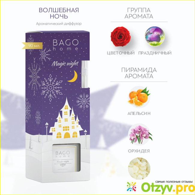 С диффузорами Bago home я знакома давно, мне нравится их качество, насыщенность, устраивает срок работы, а также радует большое разнообразие ароматов, есть даже новогодняя коллекция об одном аромате из этой коллекции я и хочу рассказать – это «Волшебная ночь».