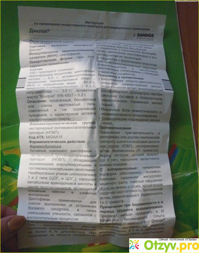 Туба как и у всех лекарств запаяна, но легко прокалывается с помощью обратной стороны крышечки. Там есть острый шип. Сам гель прозрачный и у него имеется специфический спиртовой запах не очень ярко выраженный. Диклак выпускается еще и в форме суппозиториев, таблеток, а также в виде раствора для внутримышечных иньекций. Одна ампула содержит семьдесят пять миллиграмм действующего вещества. Один суппозиторий пятьдесят или сто миллиграмм. Таблетка семьдесят пять или сто пятьдесят пять миллиграмм. А в геле пятьдесят миллиграмм. Помимо диклофенака, в геле находятся еще и дополнительные вещества. Это изопропиловый спирт, гипромелоза, масло ароматное, а также вода очищенная. Как я уже и писала, Диклак обладает противовоспалительным и обезболивающим действием. Поэтому
