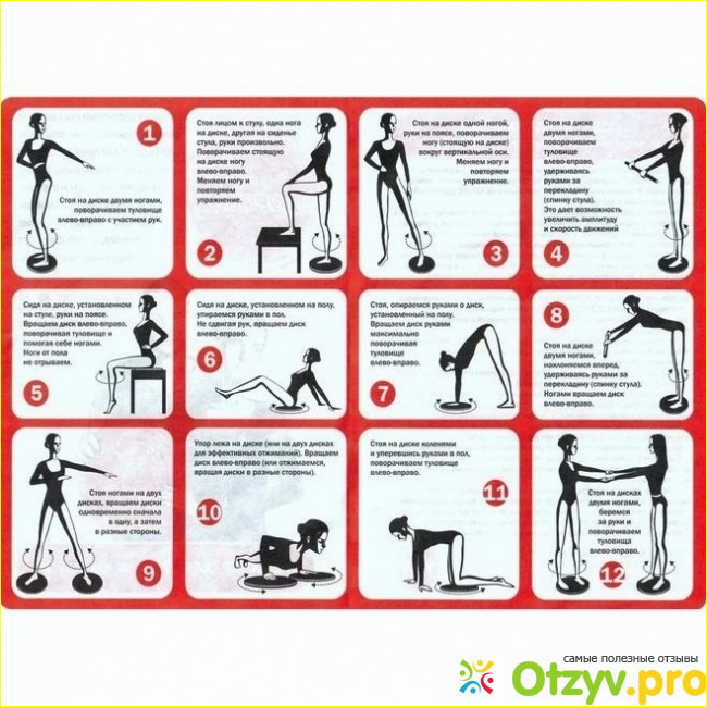 Самым простым упражнением является - стать ногами на диск и делать вращения в разные стороны. Главное - установить диск на ровную и устойчивую поверхность. С начала можно поставить перед собой стул или установить диски и держаться руками, что бы избежать падения. Вращение или скрутки делаются за счёт движения рук, тело при этом должно оставаться неподвижным. Если выпрямить руки перед собой, то можно усилить нагрузку на руки и предплечья. Следующее упражнение - это положить диск здоровья на табуретку или стул и сесть на него. При помощи работы бёдер нужно делать скрутки. При этом происходит нагрузка на косые мышцы. Упражнение, на первый взгляд не сложное, но очень эффективное. Для того, что бы работали мышцы рук и торса можно взять диск здоровья, зажать его между ладонями рук и вращать в противоположных направлениях. Есть ещё ряд упражнений, которые можно выполнять, имея два диска здоровья, но у меня он один и я обхожусь этими упражнениями. Проделывание упражнений на диске здоровья помогает в тренировке вестибулярного аппарата, улучшается координация тела, развивается гибкость, уменьшается талия, а так же происходит массаж внутренних органов. Главным правилом для занятий является проведение их в одном ритме, не смотря на то, короткое это занятие или продолжительное. Это благоприятно сказывается и на тренировке сердца. Для повышения эффекта от занятий рекомендуется выпить один-два стакана тёплой воды. При выполнении упражнений на диске здоровья нужно всё же не перегружать свой позвоночник, а чередовать проведение скруток с другими видами нагрузки.