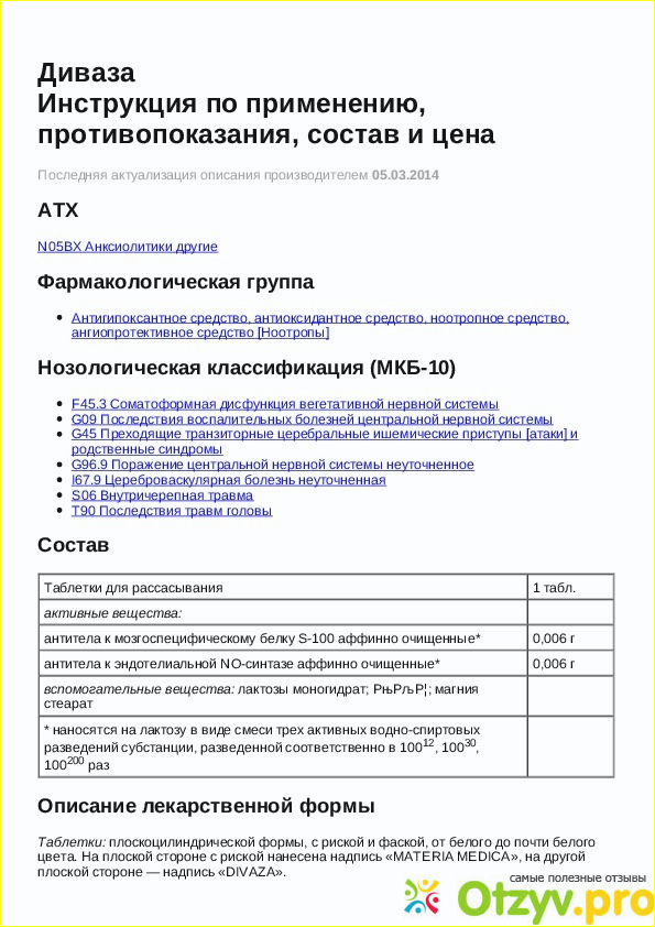 Вообще препарат "Диваза" обладает огромным рядом действий, оказывающих положительное влияние на работу головного мозга: он улучшает память, улучшает умственную работоспособность, нормализует психологическую активность, усиливает кровообращение головного мозга и прочее, прочее, прочее. Что ещё понравилось, у него очень короткий список противопоказаний - возраст до 18 лет, период лактации и беременности, непереносимость одного или нескольких компонентов препарата. Что касается применения препарата, таблету следует положить под язык до полного рассасывания. За один раз принимают 1-2 таблетки. Применияют три разаьв день, отдельно от приёма пищи. Курс применения препарата от двух недель до полу года. Всё будет зависеть от того, насколько быстро Вы почувствуете улучшение. Может назначаться для водителей, так же для людей, которым необходимо повысить своё внимание. Лично я приобретала упаковку - сто таблеток, она стоила в районе 350 рублей. Для меня - это приемлемая цена. В состав препарата входит целлюлоза. Вообще на хороший курс, чтобы реально помогло, в среднем, уйдёт 5-6 упаковок. Данный препарат необходимо беречь вдали от детей. Срок хранения - три года при температуре до 25 градусов тепла в защищённом от света месте. Что касается самих таблеток, они белого цвета. Их выпускает фирма "Материа Медица". Вообще отзывы о препарате "Диваза", в целом, очень даже неплохие.