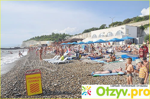 У санатория свой галечный пляж, вход в море пологий, но занимать лежаки и зонтики приходилось заранее, потому что их не хватало, много людей загорали на полотенцах.