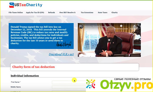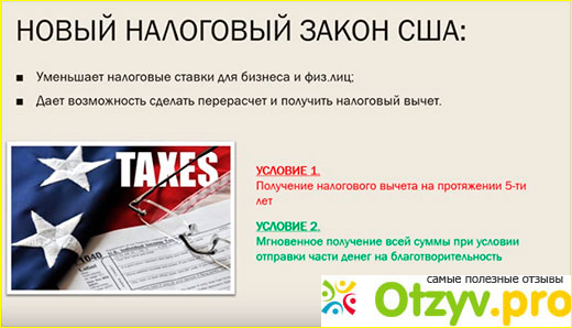 Якобы новый закон уменьшает налоговые выплаты и часть денег, переплаченных в прошлые года за время работы, можно получить обратно в виде выплаты. Она может быть растянута на 5 лет или вся сумма может быть получена сразу, если человек часть денег отдаст на благотворительность. Причем пожертвовать их можно любому человеку, даже не проживающему в США.