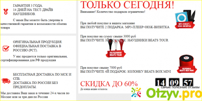 Заходя на сайт интернет магазина, радует глаз множество чрезвычайно щедрых предложений, от которых просто невозможно отказаться, или как минимум, проигнорировать их. Дорогие подарки за совершение покупки, причём заметьте – любой, даже по минимальной цене, а скупившись на определённую сумму, предлагают целую гору бесценных призов! Думаешь: Вот это сервис, вот где по-настоящему ценят покупателя, если раздают подарки, превышающие по стоимости покупку! Страница сайта пестрит заверениями в высоком качестве и аутентичности товара, а на него даётся невиданные 3 года гарантии + возможность его возвращения, или обмена в течение 2 недель. И ещё скидка на любой вид товара в ассортименте, до 60%! Ну как чего-нибудь не заказать?