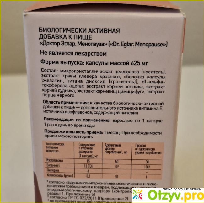 Прием не представляет собой ничего сложного, по капсуле раз в сутки. В инструкции рекомендовано принимать Dr. Eglar "MENOPAUSE" месяц, а затем делать перерыв, но я, если честно, это не соблюдаю и принимаю средство постоянно. Никаких неприятных симптомов со стороны ЖКТ, сосудов, внутренних органов и прочих частей организма я за время приема не почувствовала.