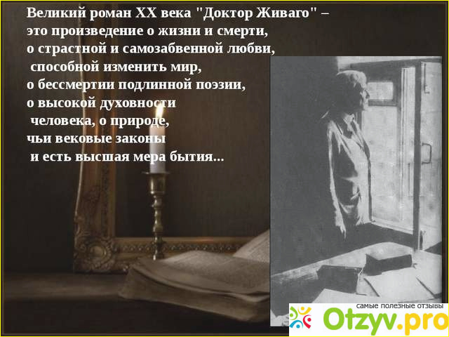 "Доктор Живаго" роман о жизни, которая происходит здесь и сейчас (относительно того времени). Это жизнь такая какая она есть. Без фильтров, как списанная или срисованная с окружающей действительности. Время действия романа описывает жизнь главного персонажа, Юрия Живаго, начиная со времени Октябрьской революции (1917) и заканчивая Великой Отечественной Войной. Живаго переживает эти огромные для него потрясения трудясь врачом на фронте. И революция, среди них, стала для него самым тяжелым испытанием. Юрий Живаго очень тяжело переживает "приход к власти вчерашних дворников", но страны своей не покидает, как бы тяжело ему ни было. Роман наполнен персонажами, которые активно участвуют в жизни страны. Ведь даже незнакомые герои оказывают влияния на судьбы друг друга через третьих или четвертых лиц, и каждый, абсолютно каждый персонаж не появляется там просто так. Это как в жизни, - просто так никогда ничего не бывает. Видимо это и есть "судьба". Только в реальной жизни мы можем даже не догадываться о всех хитросплетениях вокруг нас. А в произведении Пастренака нам, читателям, видно эту "судьбу" и все хитросплетения жизней персонажей. А у самого Живаго хитросплетения любви и отношений. Будучи интеллигентным врачом, женился на хорошенькой девушке Тоне, подруге детства. Он даже не догадывался о том, как повернется его жизнь. Как война станет его домом. Как появится Лариса Федоровна. Но, увидев ее медсестрой в госпитале, еще не до конца осознавая, что происходит, вдруг начинает любить ее. Истинная ли это любовь? Или просто страсть? Это каждый читатель определит сам для себя. Да, они изменяли своим любимым, но ведь и они любили. Достойна ли такая любовь? А семьи свои рушить они не хотели. Даже когда жизнь заставила Живаго расстаться с любимой Ларисой, а жена Тоня иммигрировала за границу с семьей, то Живаго продолжит жить. Жить с дочерью дворника, семья которого ранее прислуживала семье доктора. Поднимается в романе и проблема взаимоотношений родителей и детей (на примере многих персонажей романа).