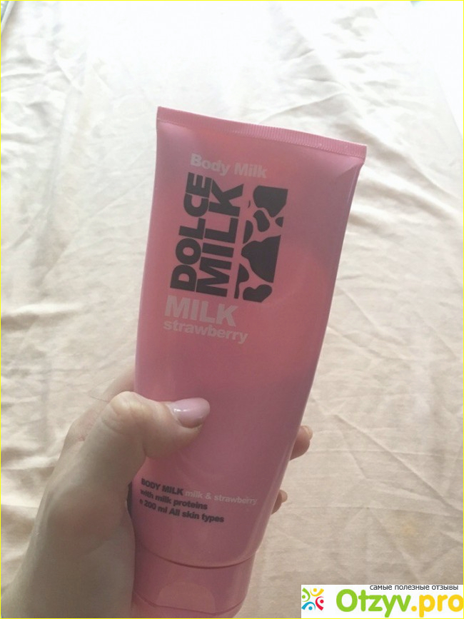 Молочко Dolce Milk у меня с запахом клубники и. как я говорила выше - это любимый запах моего супруга. Запах настолько соблазнительный - аромат молока и земляники.