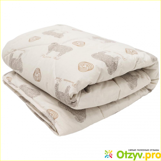 Сверху одеяло обтянуто сатиновым чехлом приятного бежевого цвета. Внутри одеяло наполнено шерстью овец в количестве 30% от общей массы, остальные 70% приходятся на полиэфирное волокно. Данные одеяла очень теплые и легкие, вес изделия составляет менее 500 гр.
